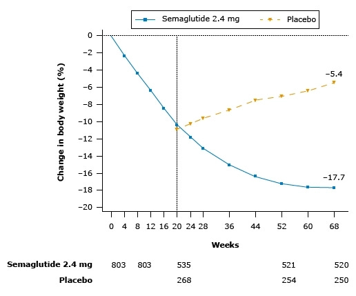 Rubino D, et al. Effect of Continued Weekly Subcutaneous Semaglutide vs Placebo on Weight Loss Maintenance in Adults With Overweight or Obesity: The STEP 4 Randomized Clinical Trial. JAMA. 2021;325(14):1414–1425.